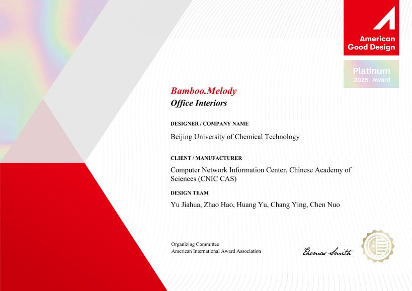 Recently, the official list of winners for the 2025 American Good Design Award — a prestigious authority in the global design field — was officially unveiled. “Bamboo Melody,” the public space renovation project of the Computer Network Information Center of the Chinese Academy of Sciences (CNIC CAS) led by the team of Associate Professor Yu Jiahua from the Department of Art and Design of Beijing University of Chemical Technology, stood out from over 10,000 global entries. Relying on its groundbreaking material design innovation, profound cultural connotation and excellent cost control, this design work claimed the highest honor in the award’s “Interior Architecture and Interior Design” category: the American Good Design Platinum Award!